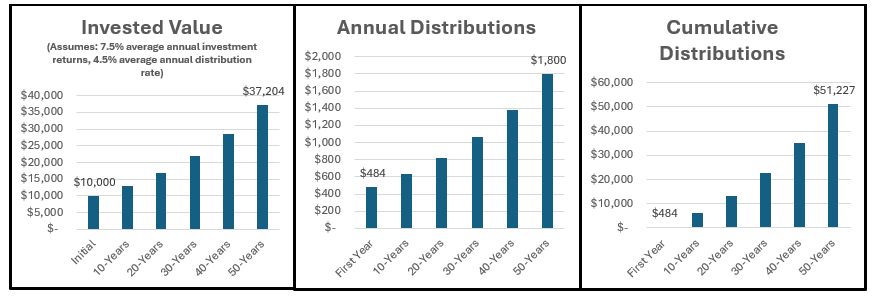 The first chart shows that the invested value grows from $10,000 to $37,200 over 50 years. The second shows that annual fund distributions increase from $484 to $1,800 per year at the end of 50 years. The last chart shows how the cumulative fund distributions will have generated over $51,000 in fund distributions over a 50-year period! That’s right, the $10,000 bequeath generates over 5 times its initial amount in distributions over a 50-year period. From that point, it just keeps on going. This is what is meant when we say that an Endowment Fund contribution provides perpetual support to St. Paul’s. The Endowment’s support for St. Paul is forever.